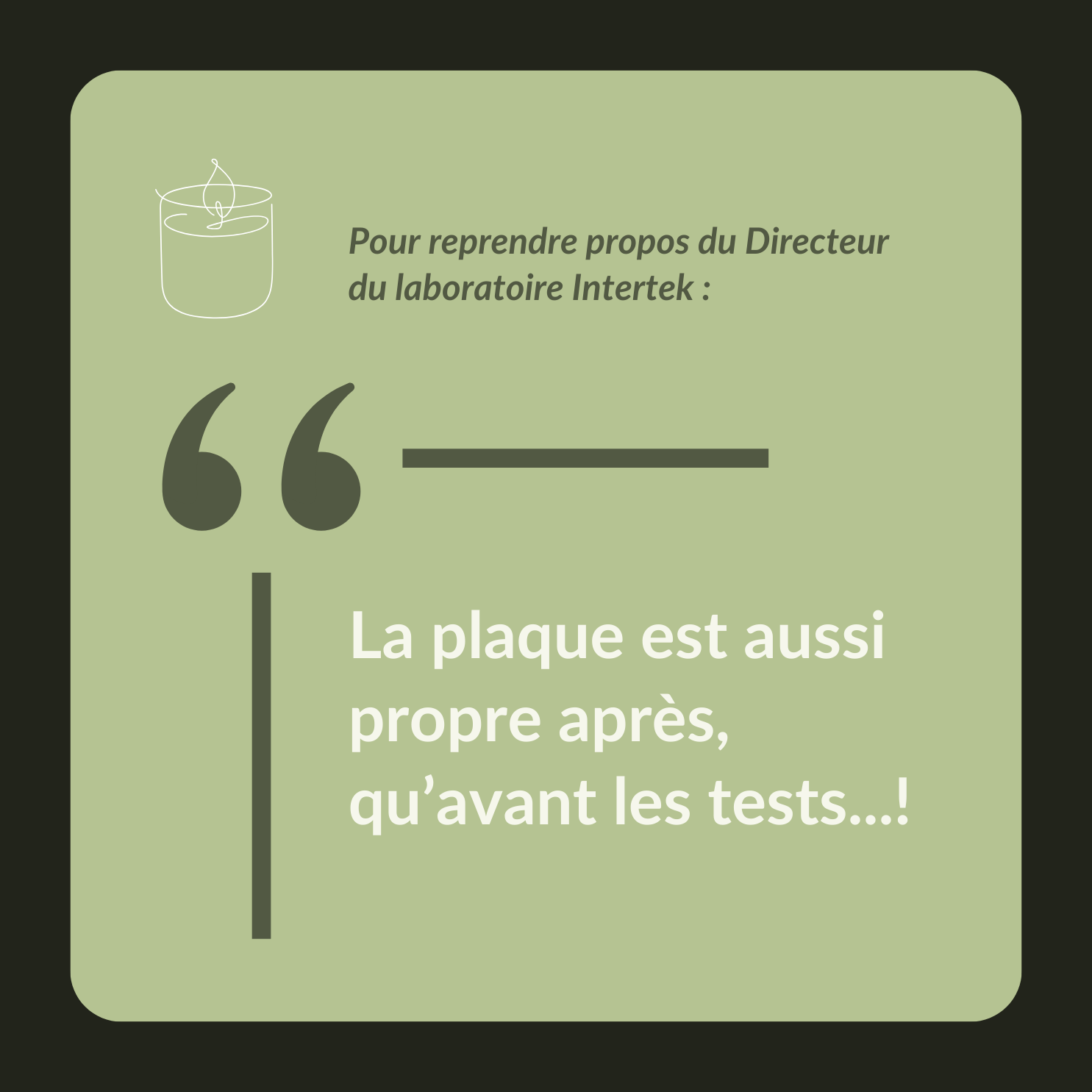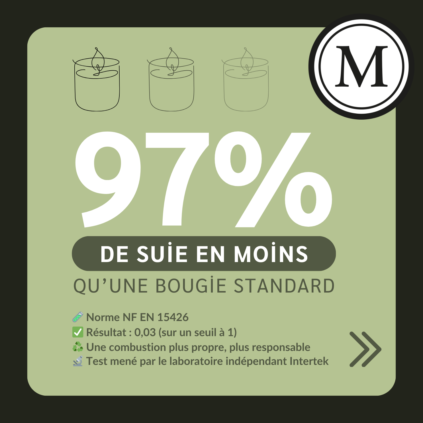 Afin de tester la qualité de nos bougies, nous avons réalisé un test de suie. Mené par le laboratoire indépendant Intertek (selon la norme NF EN 15426), nos tests d’émanation de suie montrent des résultats exceptionnellement bas, avec un taux mesuré de 0,03, soit seulement 3 % de la limite fixée par la norme. Avec une production de suie jusqu’à 97 % inférieure au seuil maximal, notre bougie offre une combustion nettement plus propre et respectueuse de l’environnement.